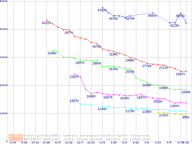 | [↑前グラフ]: | Deskstar 120GXP (7200rpm,2MB,UltraATA/100,BB)の最安値推移 |