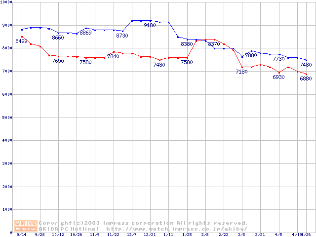 | [↑前グラフ]: | DiamondMax Plus 9 (7200rpm,2MB,UltraATA/133,FDB)の最安値推移 |