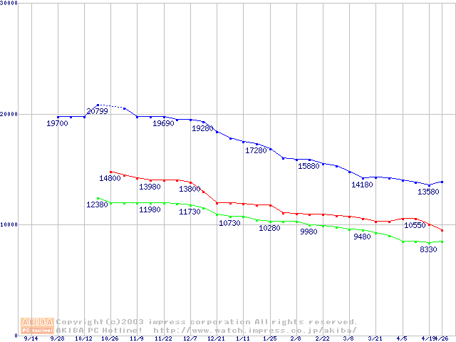 | [↓次グラフ]: | Barracuda ATA IV (7200rpm,UltraATA/100,2MB,40GB/Platter,FDB)の最安値推移 |