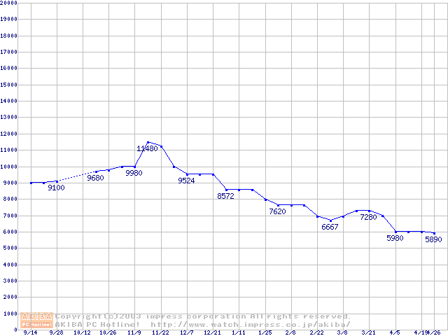 | [↓次グラフ]: | PC133 SDRAM DIMM CasLatency=3の最安値推移 |
