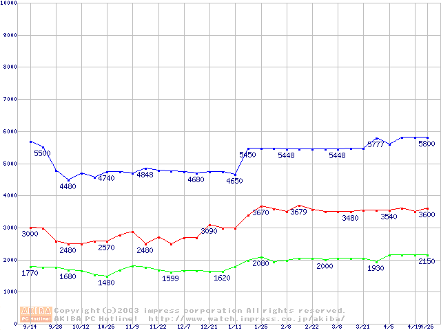 | [↓次グラフ]: | PC133 SDRAM DIMM CasLatency=2の最安値推移 |