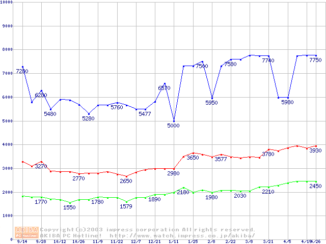| [↑前グラフ]: | PC133 SDRAM DIMM CasLatency=3 ECC対応 Registeredタイプの最安値推移 |
