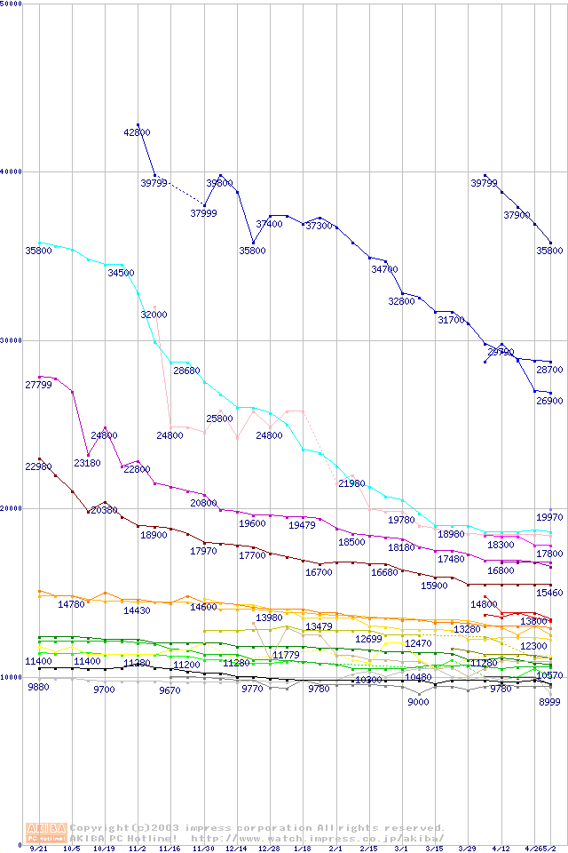 2.5インチHDD主要製品(最安値1万円未満)の最安値推移