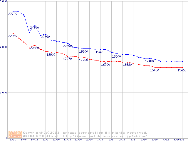| [↑前グラフ]: | 2.5インチHDD 40GB~50GB未満(9.5mm厚,4200rpm)の最安値推移 |