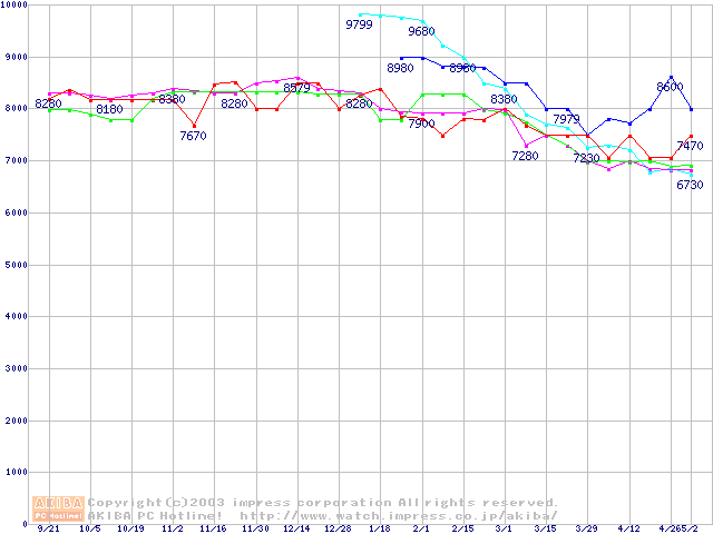 | [↓次グラフ]: | HDD 60GB~80GB未満(5400rpmクラス)の最安値推移 |