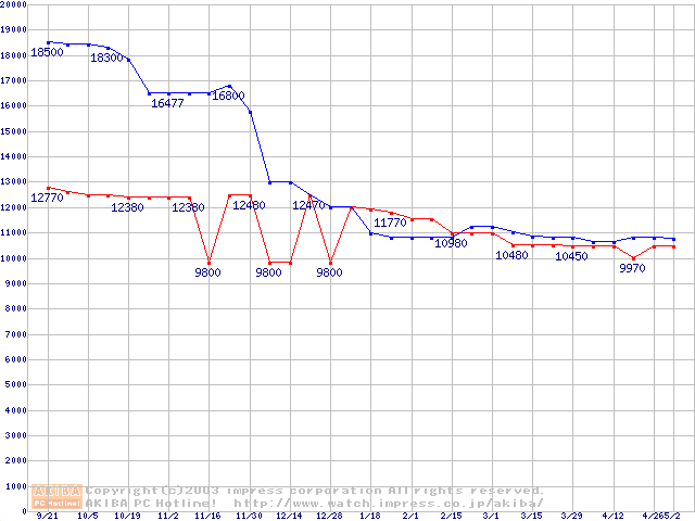 メモリ主要製品(最安値1万円以上)の最安値推移