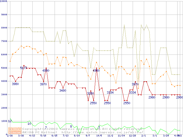 PC133 SDRAM DIMM CasLatency=3 ECC対応の最安値推移