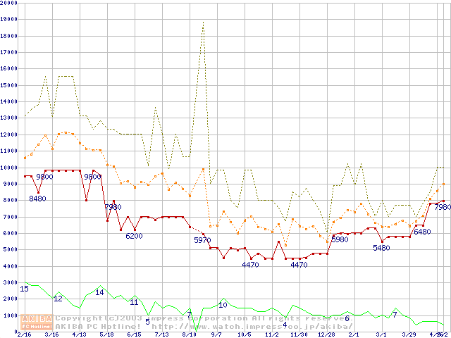 PC133 SDRAM DIMM CasLatency=3 ECC対応の最安値推移