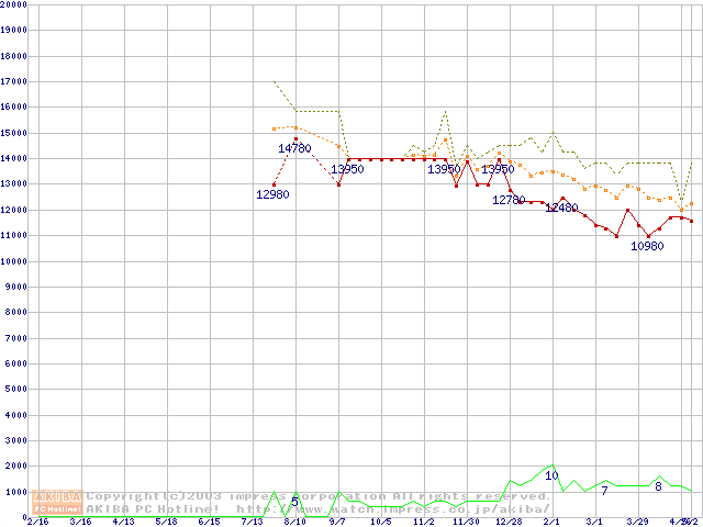 Socket 370 (FC-PGA,FSB 133MHz,L2 256KB,Coppermine)の最安値推移