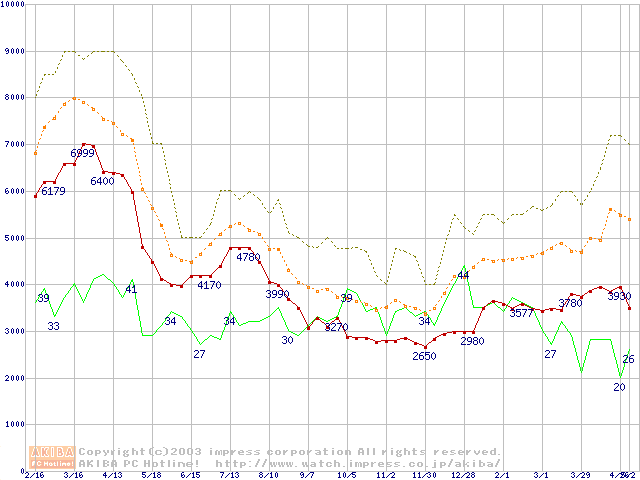 PC100 SDRAM DIMM CasLatency=2の最安値推移