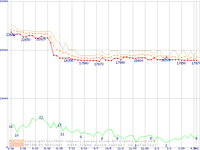 Socket 370 (FC-PGA2,FSB 133MHz,L2 512KB,Tualatin)の最安値推移