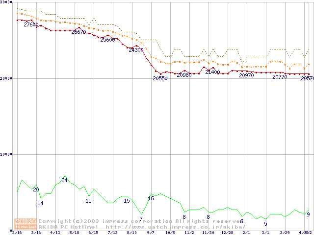 Socket 370 (FC-PGA2,FSB 133MHz,L2 512KB,Tualatin)の最安値推移