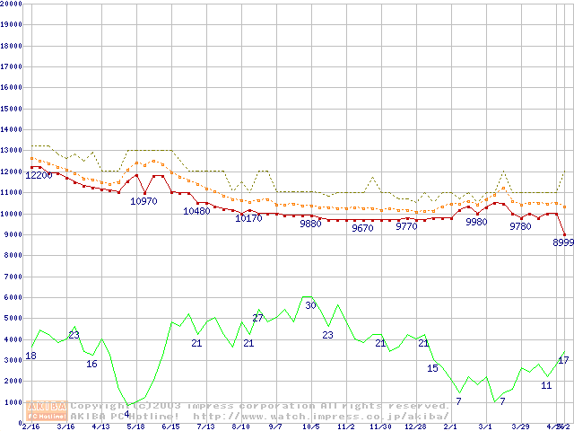 Travelstar 40GN (9.5mm,4200rpm,UltraATA/100,2MB,FDB,20GB/Platter)の最安値推移
