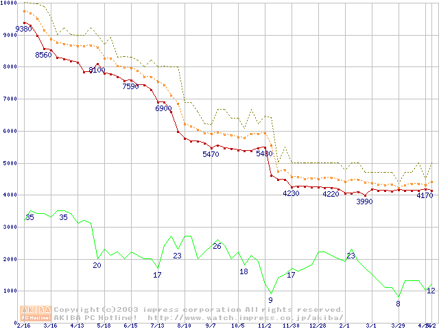 Socket 370 (FC-PGA2,FSB 100MHz,L2 256KB,Tualatin)の最安値推移