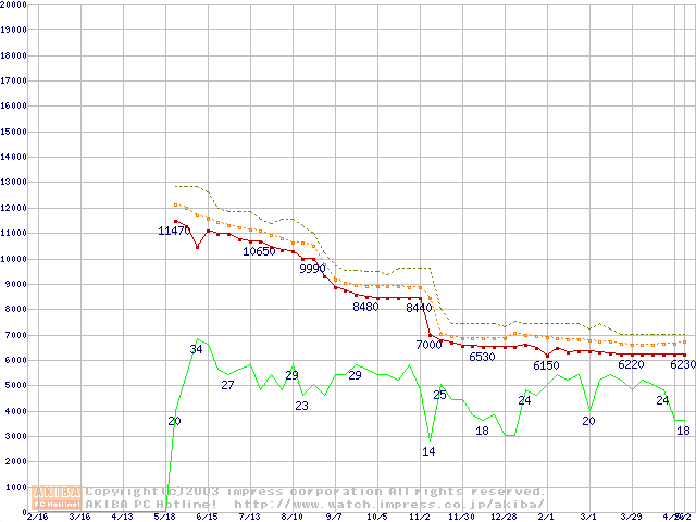 Socket 370 (FC-PGA2,FSB 100MHz,L2 256KB,Tualatin)の最安値推移