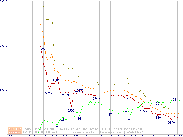 PC3200(DDR400) DDR SDRAM DIMMの最安値推移
