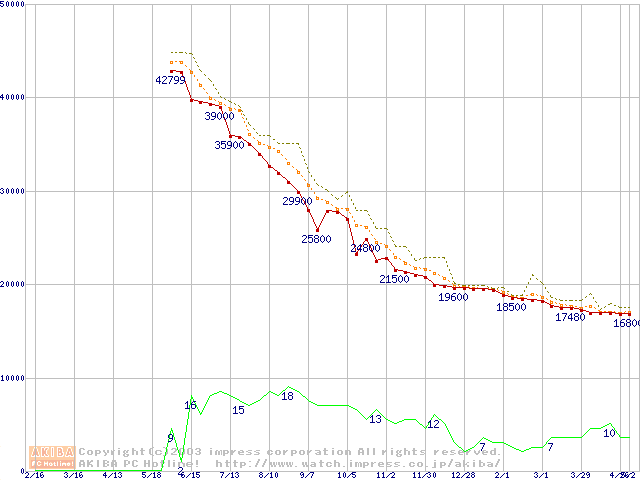 MKシリーズ (9.5mm,5400rpm,16MB,FDB,20GB/Platter)の最安値推移