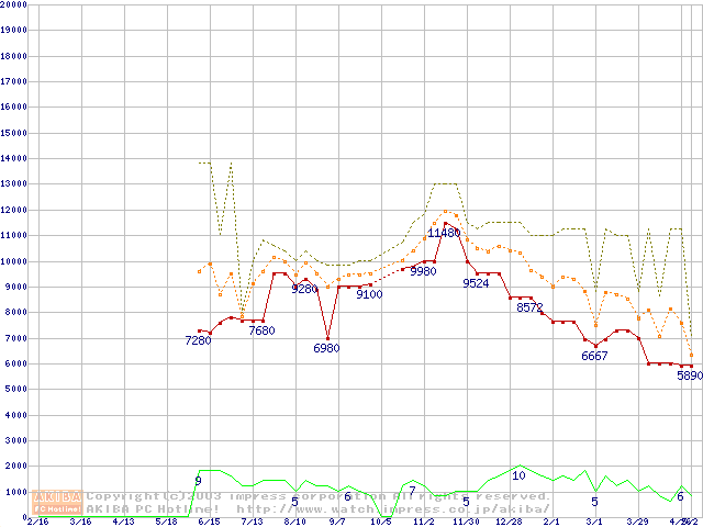 PC2100(DDR266) DDR SDRAM DIMM(CL 2.0) ECC対応 Registeredタイプの最安値推移
