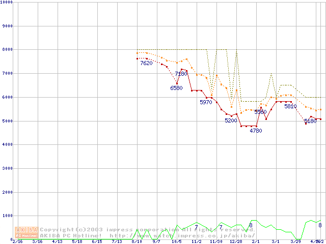 Socket 370 (FC-PGA,FSB 100MHz,L2 128KB,Coppermine)の最安値推移