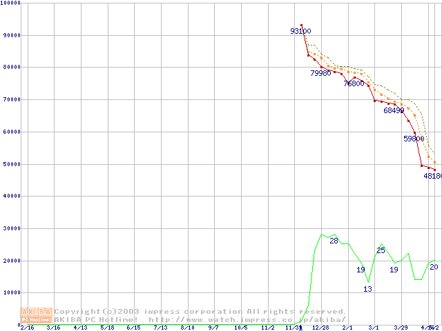 Socket 478 (micro-PGA,FSB 533MHz,L2 512KB,Hyper-Threading,Northwood)の最安値推移