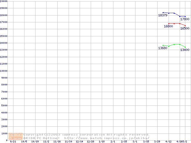 | [↑前グラフ]: | Travelstar 80GN (9.5mm,4200rpm,UltraATA/100,8MB,FDB,40GB/Platter)の最安値推移 |