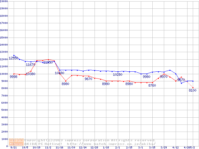 | [↑前グラフ]: | Socket A (OPGA,FSB 266MHz,L2 256KB,Thoroughbred)の最安値推移 |