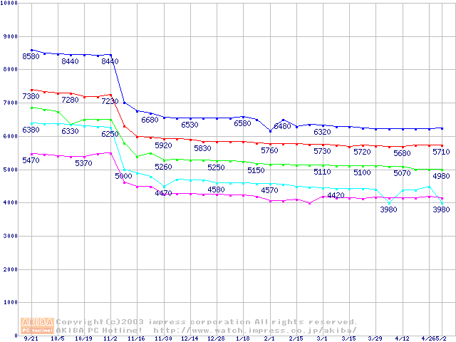| [↑前グラフ]: | Socket 370 (FC-PGA,FSB 133MHz,L2 256KB,Coppermine)の最安値推移 |