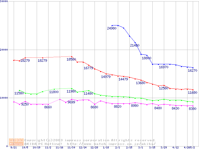 | [↑前グラフ]: | DiamondMax 16 (5400rpm,UltraATA/133,2MB,80GB/Platter,BB)の最安値推移 |