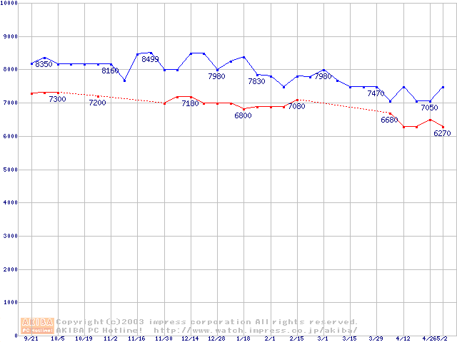 | [↑前グラフ]: | Fireball 3 (5400rpm,UltraATA/133,2MB,FDB)の最安値推移 |