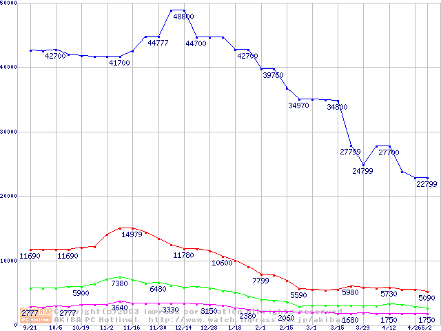 | [↑前グラフ]: | PC3500(DDR433) DDR SDRAM DIMMの最安値推移 |