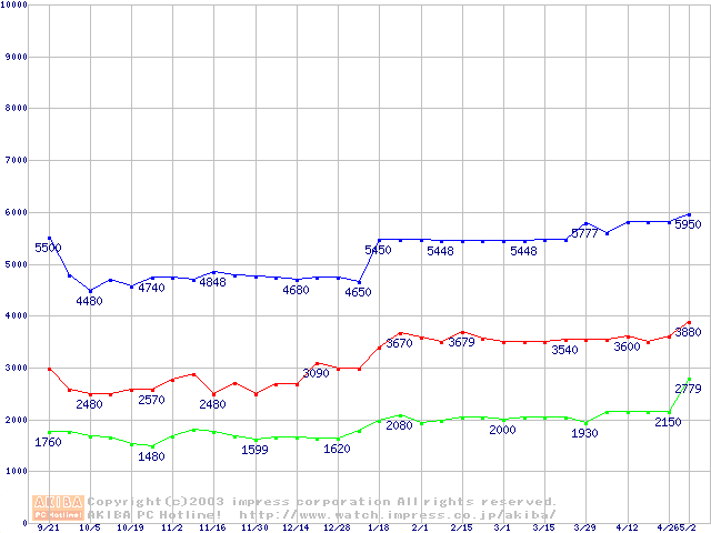 | [↓次グラフ]: | PC133 SDRAM DIMM CasLatency=2の最安値推移 |