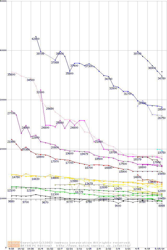 2.5インチHDD主要製品(最安値1万円未満)の最安値推移