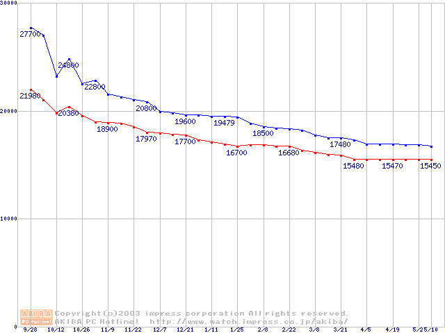 | [↑前グラフ]: | 2.5インチHDD 40GB~50GB未満(9.5mm厚,4200rpm)の最安値推移 |
