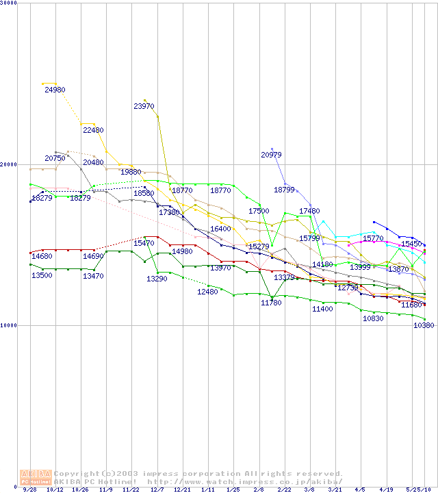 HDD主要製品(最安値1万5千円~2万円未満)の最安値推移