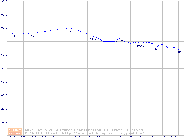 | [↑前グラフ]: | HDD 20GB~30GB未満(5400rpmクラス)の最安値推移 |