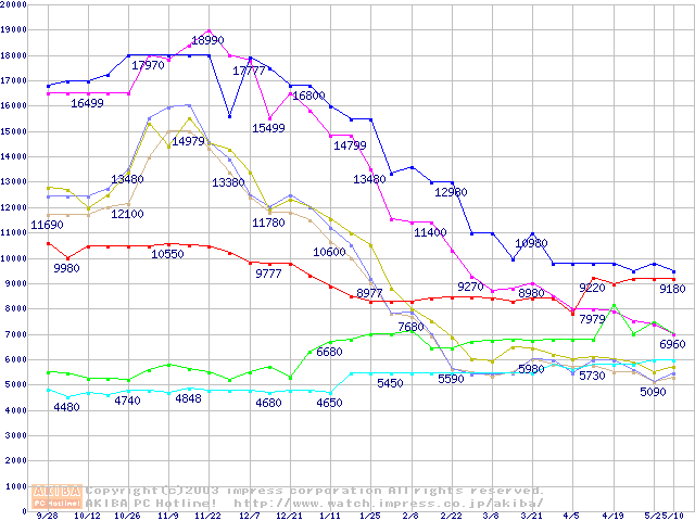 メモリ主要製品(最安値1万円以上)の最安値推移