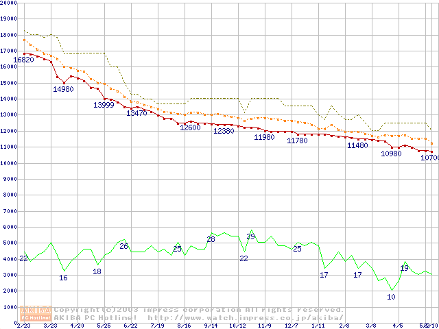 Travelstar 40GN (9.5mm,4200rpm,UltraATA/100,2MB,FDB,20GB/Platter)の最安値推移