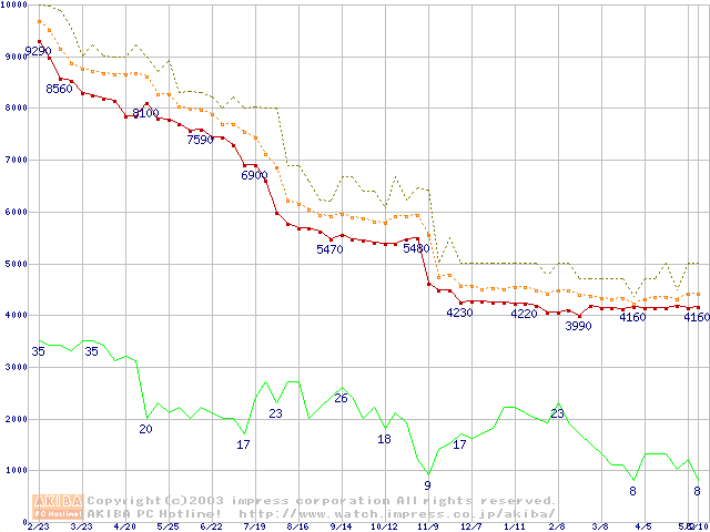 Socket 370 (FC-PGA2,FSB 100MHz,L2 256KB,Tualatin)の最安値推移