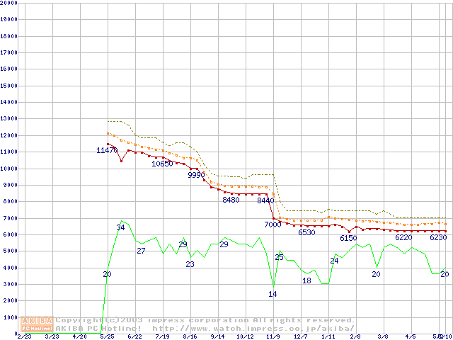 Socket 370 (FC-PGA2,FSB 100MHz,L2 256KB,Tualatin)の最安値推移
