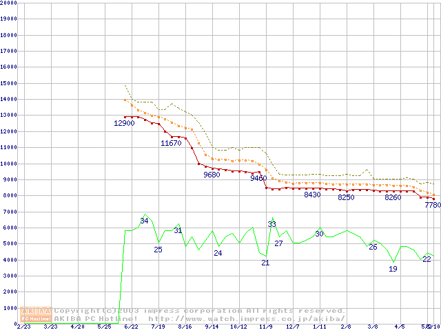 Socket 478 (micro-PGA,FSB 400MHz,L2 128KB,Willamette)の最安値推移