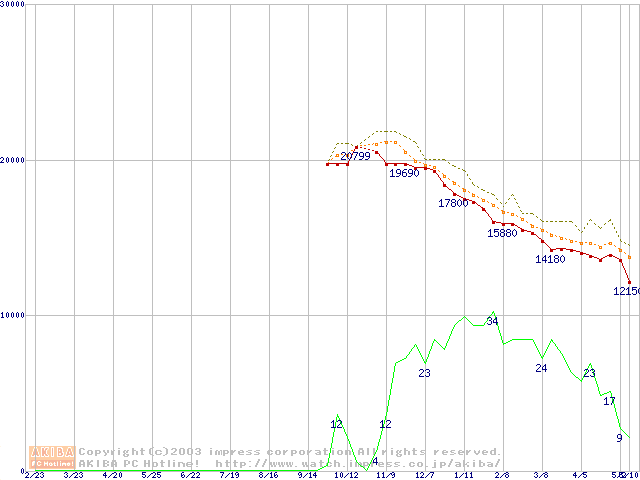 HDD主要製品(最安値1万円~1万5千円未満)の最安値推移