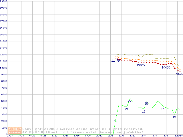 Socket 478 (micro-PGA,FSB 400MHz,L2 128KB,Northwood)の最安値推移