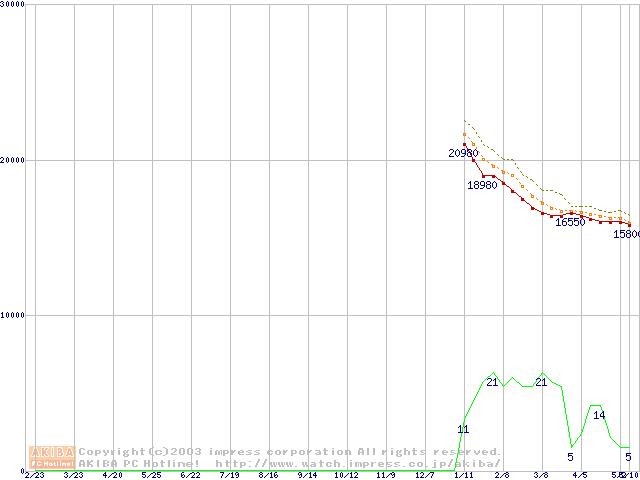 HDD主要製品(最安値1万5千円~2万円未満)の最安値推移
