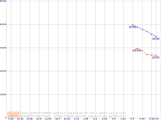 | [↑前グラフ]: | Travelstar 40GNX (9.5mm,5400rpm,UltraATA/100,8MB,FDB,20GB/Platter)の最安値推移 |