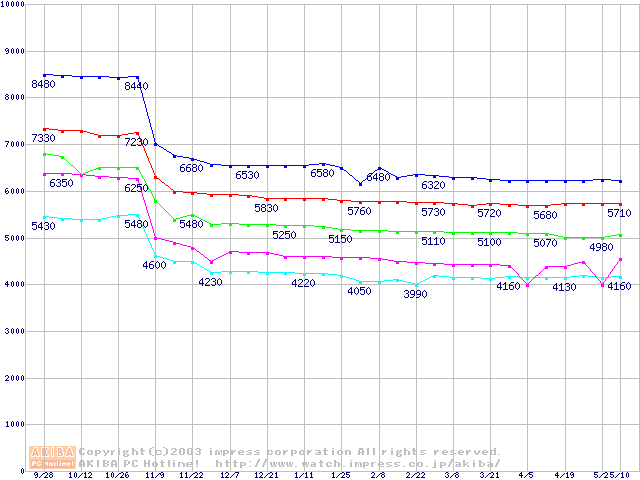 | [↑前グラフ]: | Socket 370 (FC-PGA,FSB 133MHz,L2 256KB,Coppermine)の最安値推移 |