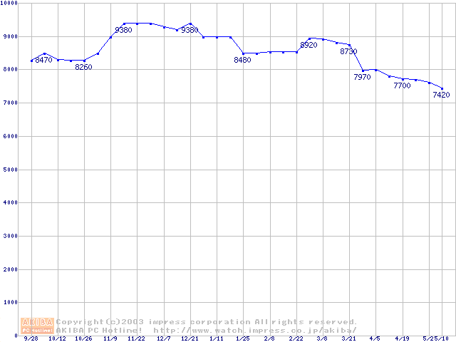 | [↑前グラフ]: | Deskstar 180GXP (7200rpm,2MB,UltraATA/100,FDB)の最安値推移 |
