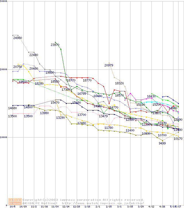 HDD主要製品(最安値1万5千円~2万円未満)の最安値推移