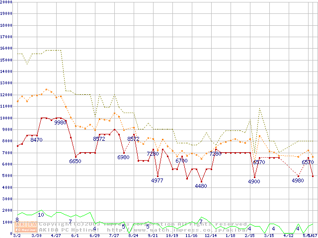 PC100 SDRAM DIMM CasLatency=2 ECC対応の最安値推移