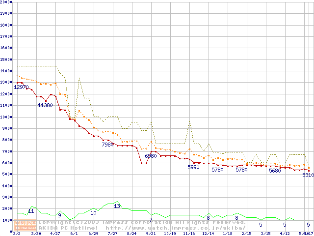 Socket A (PGA,FSB 266MHz,L2 256KB,Thunderbird)の最安値推移