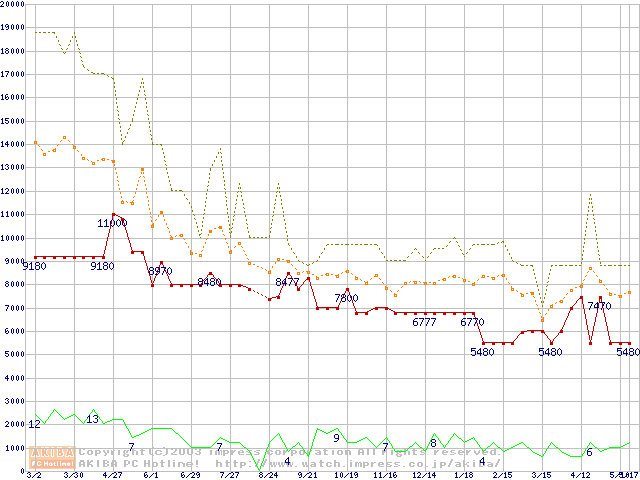 PC133 SDRAM DIMM CasLatency=3 ECC対応 Registeredタイプの最安値推移